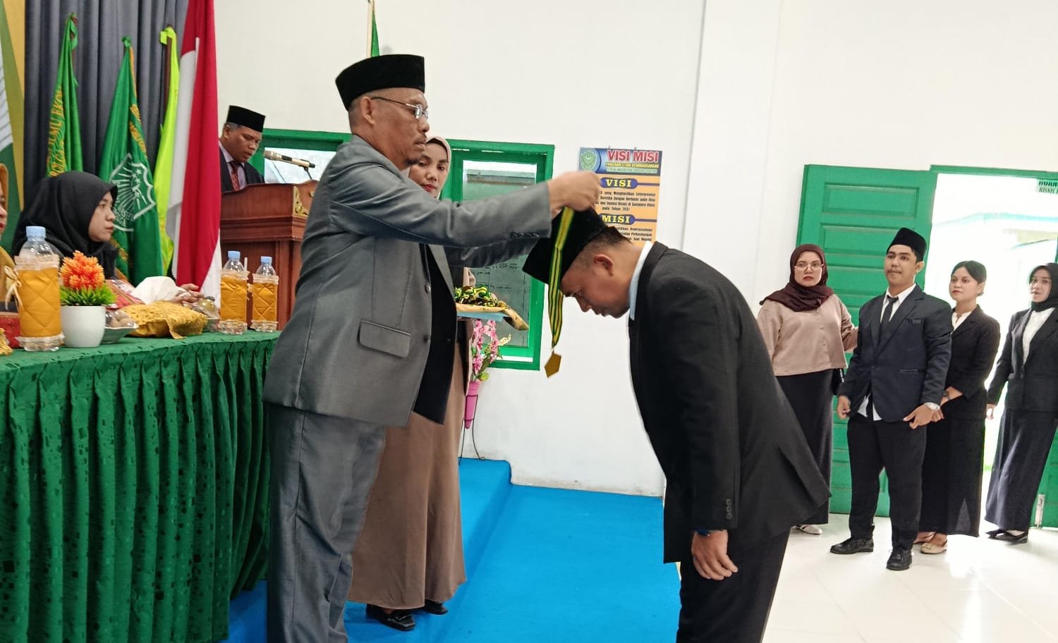 Acara yudisium berlangsung khidmat dan tertib, diawali dengan pembacaan ayat suci Al-Qur’an, dilanjutkan menyanyikan Lagu Indonesia Raya, Mars Al Washliyah, Himne Al Washliyah, serta doa bersama.