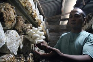 Dani (36) menunjukkan jamur hasil budidaya di Desa Kualatanjung, Kabupaten Batubara, Sumatera Utara, Selasa (2/9). Sejak 2024, Dani memperoleh bantuan modal usaha dari Inalum berupa dana puluhan juta rupiah.Topiksumut.id/Risky Cahyadi
