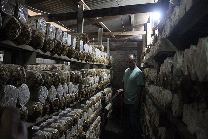 Dani (36) berada di kumbung atau tempat budidaya jamur tiram di Desa Kualatanjung, Kabupaten Batubara, Sumatera Utara, Selasa (2/9). Dani memanfaatkan sebagian lahan tempat tinggalnya sebagai kumbung atau tempat budidaya jamur tiram.Topiksumut.id/Risky Cahyadi