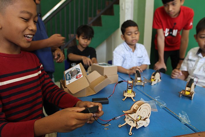 Kegiatan belajar robotic secara gratis tersebut dibantu tenaga pengajar yang bertujuan menumbuhkan minat para murid terhadap dunia robotic serta mengantisipasi kecanduan gawai.