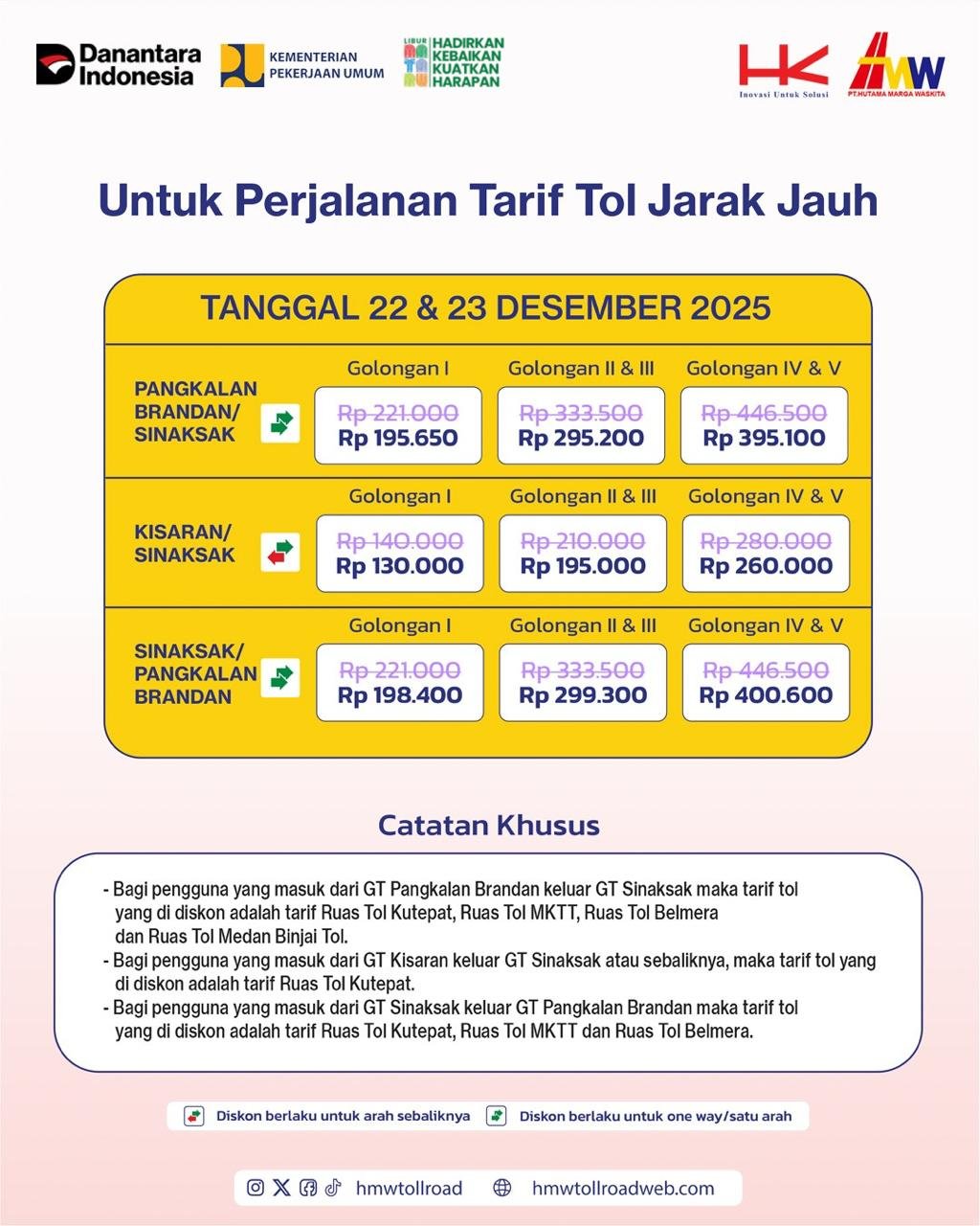 “Atas persetujuan dari Badan Pengatur Jalan Tol (BPJT) potongan tarif tol 20 persen ini berlaku untuk seluruh golongan I hingga V perjalanan menerus, yaitu dari Gerbang Tol Pangkalan Brandan menuju Gerbang Tol Sinaksak maupun arah sebaliknya,” ujar Dindin, Senin (15/12/2025).