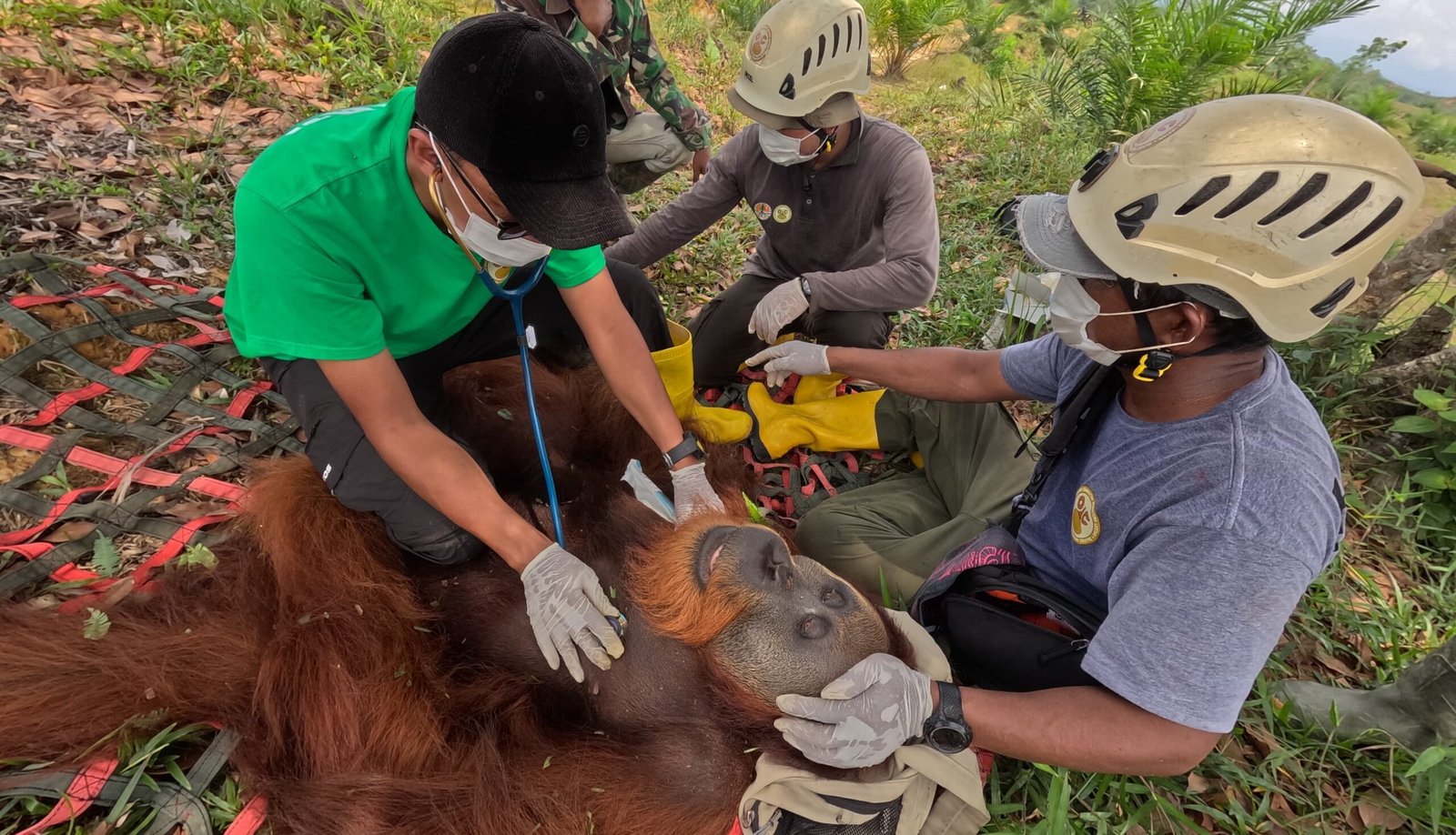 “Proses evakuasi dilakukan pembiusan demi memastikan keselamatan satwa oleh dokter hewan. Selain itu, orangutan dengan berat kurang lebih 60 kilogram tersebut diperiksa kesehatannya dan diketahui berjenis kelamin jantan,” kata Bobby.