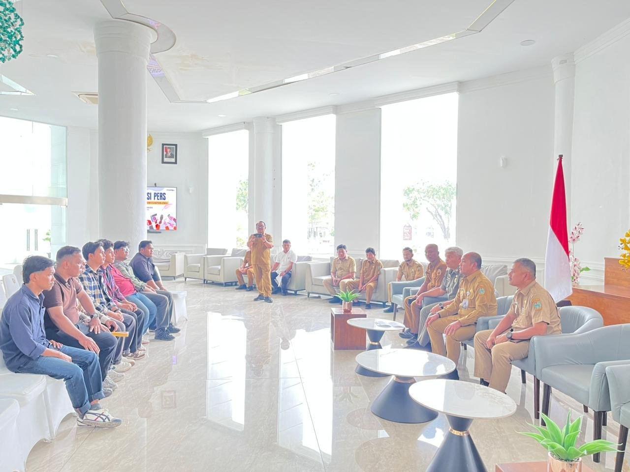 Usai berorasi di depan pintu masuk kantor Gubsu, akhirnya para mahasiswa ini disambut dan diajak berdialog dengan beberapa pejabat dari Dinas Perizinan Sumatera Utara, Satpol PP, dan dinas terkait lainnya.