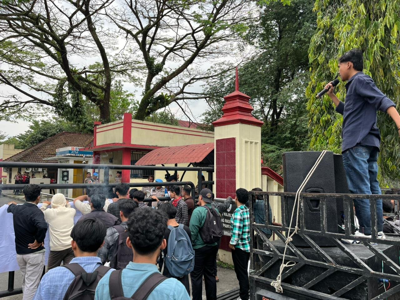 Amatan wartawan dilokasi, para mahasiswa ini datang membawa pengeras suara dan spanduk yang bertuliskan isi daripada tuntutan mereka.