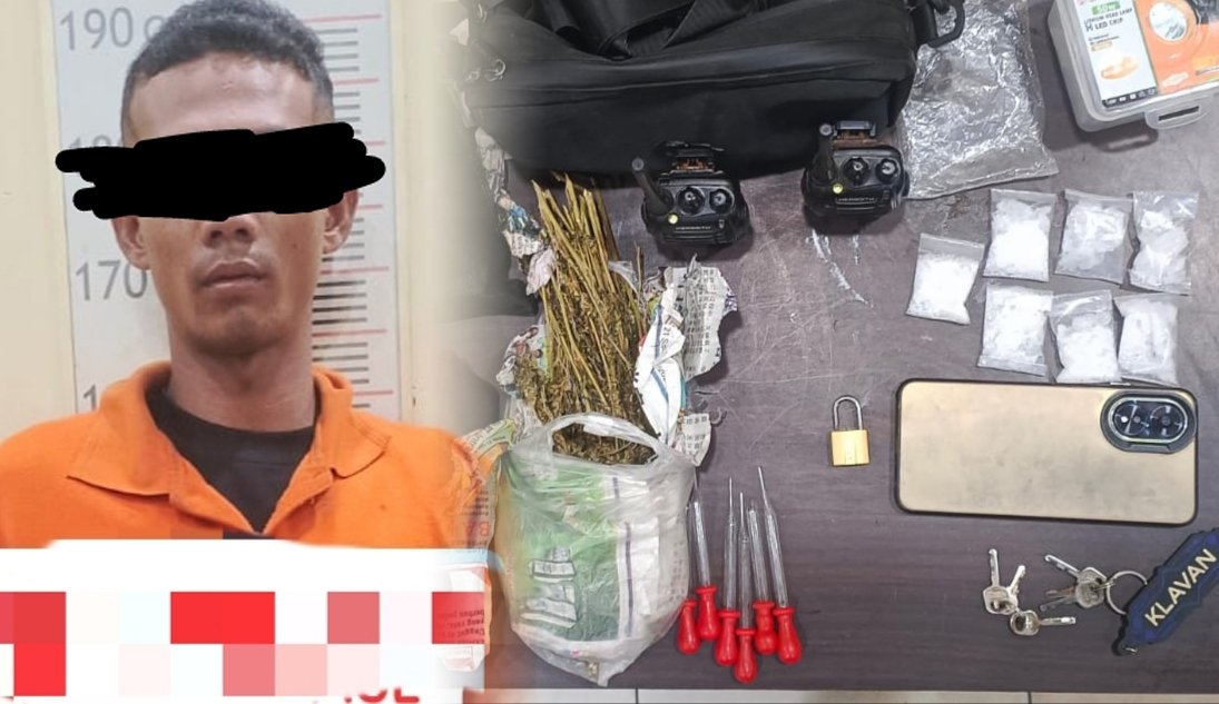 Tersangka berinisial MLH beserta barang bukti narkoba diringkus polisi di Dusun VI, Desa Pematang Tengah, Kecamatan Pematang Jaya, Kabupaten Langkat, Sumatera Utara, Rabu (8/4/2026).