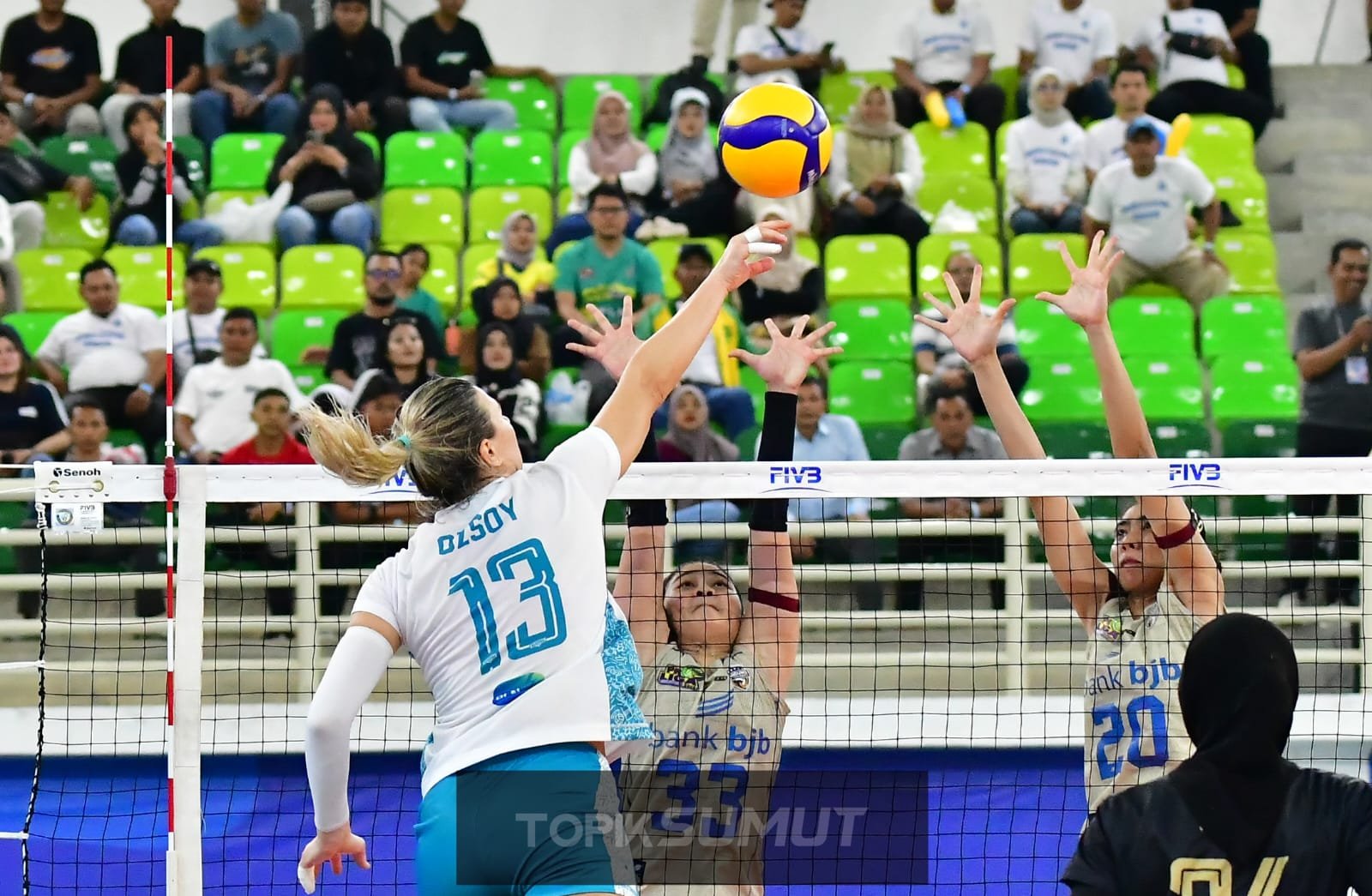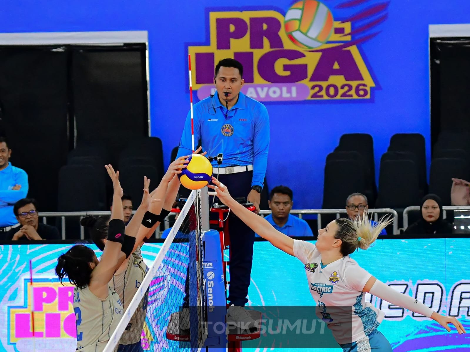 Topiksumut.id, MEDAN – Atlet Volli Dari Jakarta Electric PLN Mobile Neriman Ozsoy (Baju putih) melakukan pukululan smash yang berusaha diblok pevoli Bandung BJB Tandamata Maradanti Namira (kiri) dan Anastasia Guerra (kedua kiri) pada pertandingan Putaran Pertama Minggu Kedua Proliga 2026 di GOR Voli Indoor Sports Center Sumatera Utara, Kabupaten Deli Serdang, Sabtu (17/1/2026).
