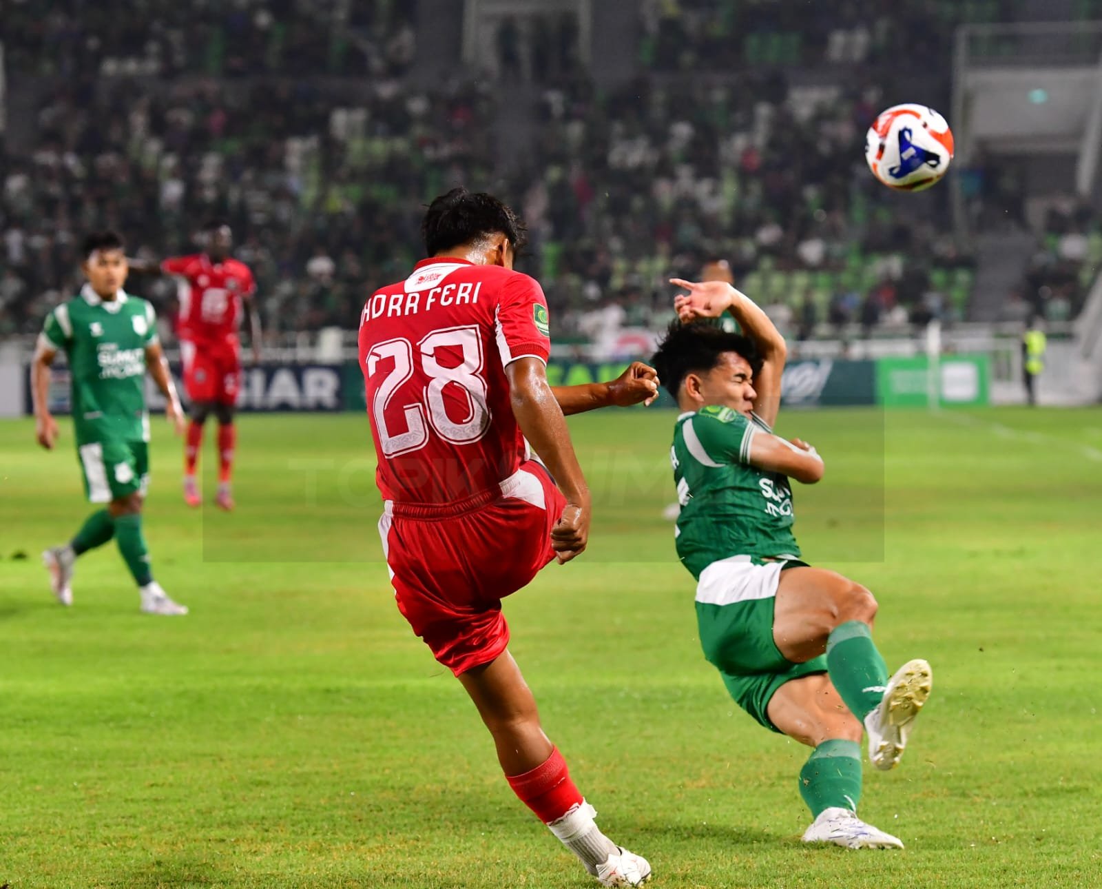 Kebuntuan akhirnya pecah di menit ke-30! Fellipe Cadenazi, sang penyerang andalan, menjadi pahlawan dengan menyambut umpan silang dengan sempurna, menggetarkan jala gawang Bekasi City. 1-0 untuk tuan rumah!
