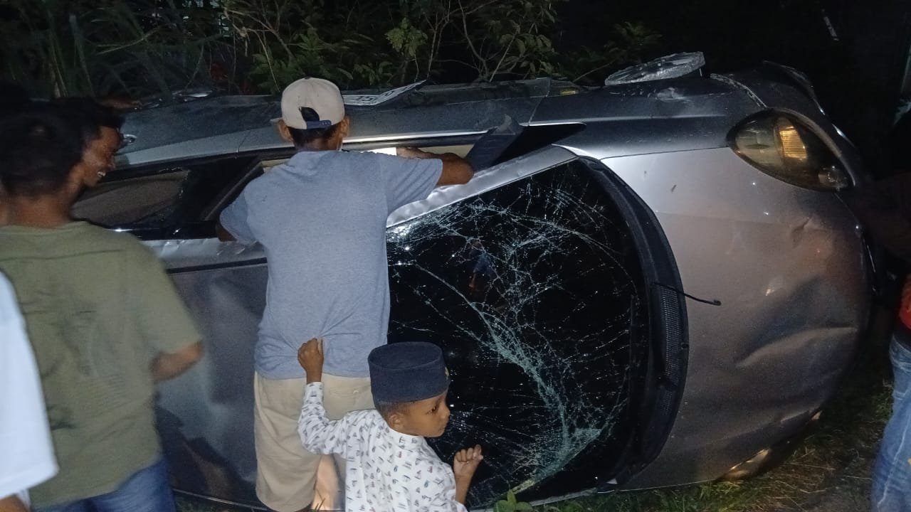 Kondisi mobil Honda Brio dihancuri warga usai tabrak lari pengendara motor di Kota Binjai, pada Rabu (6/8/2025) malam.