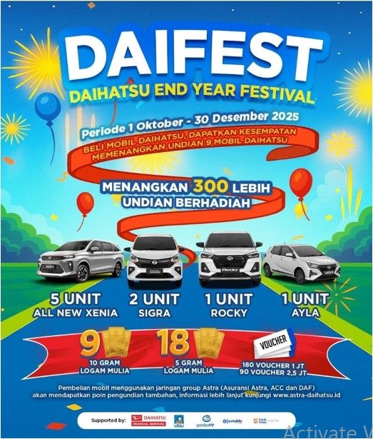 Program DAIFEST berlangsung sejak 1 Oktober hingga 30 Desember 2025. Setiap pembelian mobil Daihatsu dalam periode tersebut berkesempatan mengikuti undian berhadiah dengan total lebih dari 300 hadiah, termasuk 9 unit mobil Daihatsu yang terdiri dari All New Xenia, Sigra, Rocky, dan Ayla, serta logam mulia dan voucher belanja.