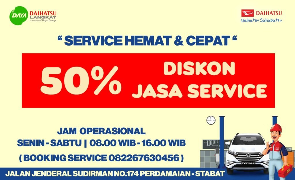 Di sisi layanan purnajual, bengkel resmi Daihatsu Langkat memberikan diskon jasa servis hingga 50 persen serta bonus 1 liter oli bagi pelanggan yang melakukan perawatan berkala. Promo ini bisa dimanfaatkan dengan terlebih dahulu melakukan pemesanan melalui layanan booking servis di nomor 0822-6763-0456.